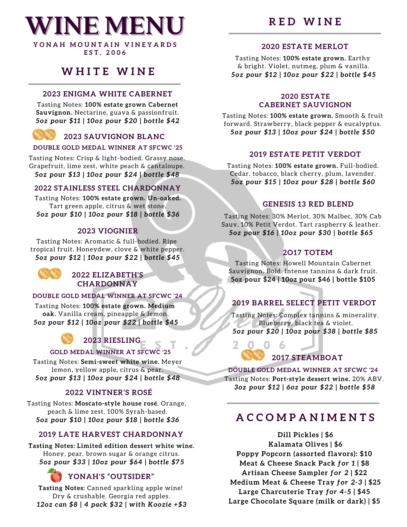 Yonah Mountain Vineyards is a two-hundred acre family winery located on the southeastern base of iconic Yonah Mountain. Making world class wines and enjoying the process is our ultimate goal. Rolling hills and sandy soil are the perfect setting for our twenty planted acres of Sauvignon Blanc, Chardonnay, Petit Manseng, Cabernet Sauvignon, Merlot, Cabernet Franc, Malbec, and Petit Verdot.